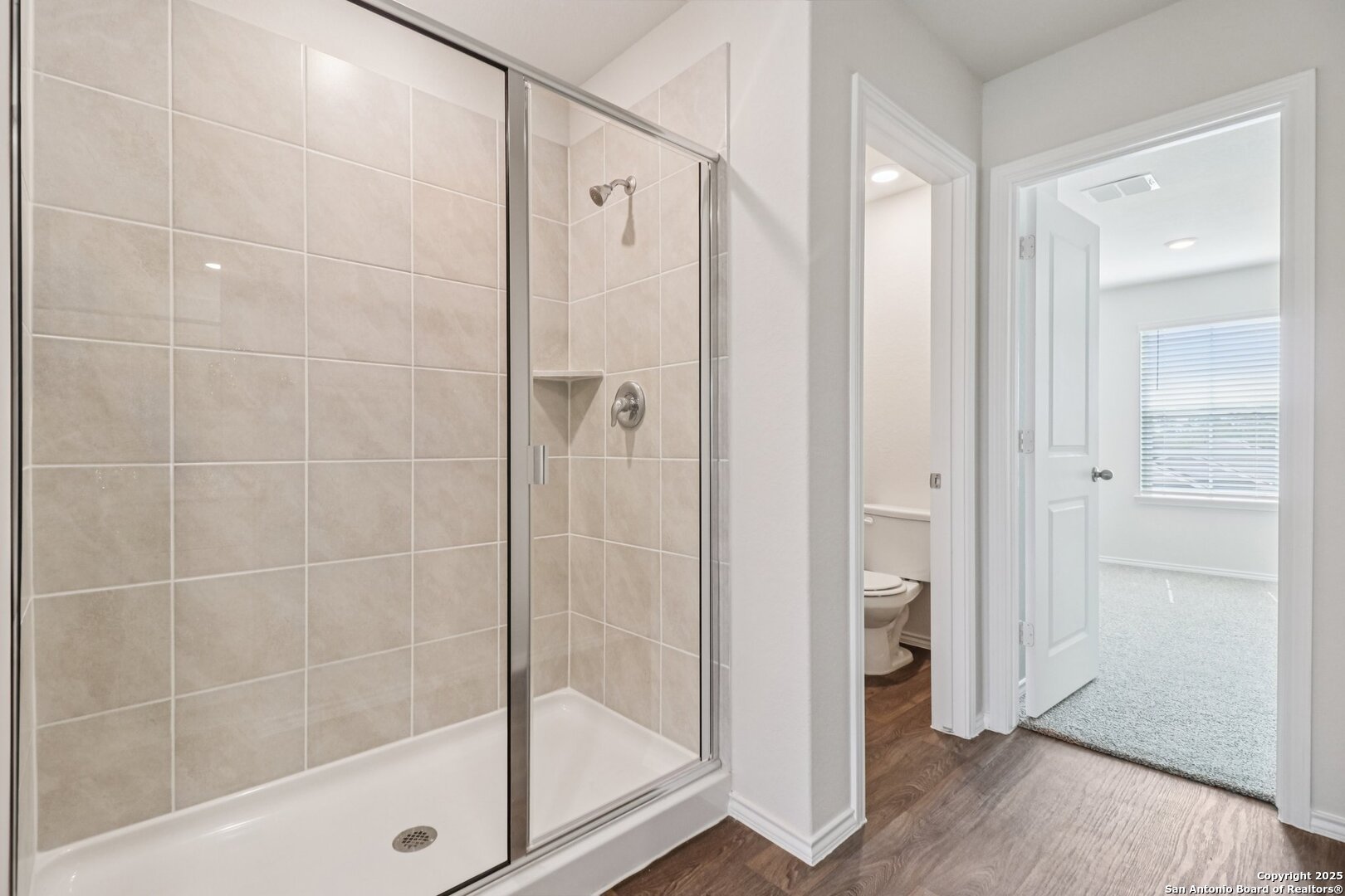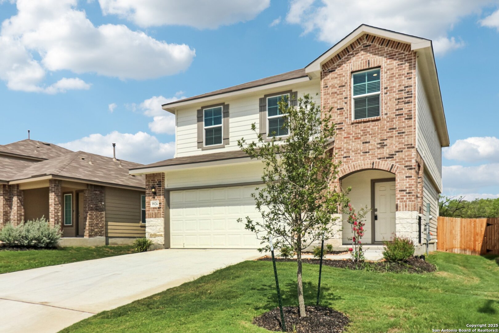 Step into The Grace floor plan in Hacienda in San Antonio, TX. This home showcases 2 classic front exteriors, full yard landscaping and irrigation and a 2-car garage. Inside this 4 bedroom, 2.5 bathroom home, you will find 1952 square feet of living space designed to meet your needs. The arched front patio opens to a grand foyer which then leads to a spacious living room. The living room blends seamlessly into the kitchen and dining area in an open concept floorplan. Your kitchen is built for the ultimate home chef and offers granite counter tops, stainless steel appliances, and a kitchen island overlooking the living room. Don't forget a deep, single basin kitchen sink for convenience and ease. The staircase leads to the upstairs main bedroom suite, all secondary bedrooms, and your utility room. The Grace floor plan is ideal if you want to keep your entertaining space and private space separate. The upstairs main bedroom has an attached bathroom that includes a tiled walk-in shower, separate water closet and plenty of storage space with built-in shelving and a grand walk-in closet.