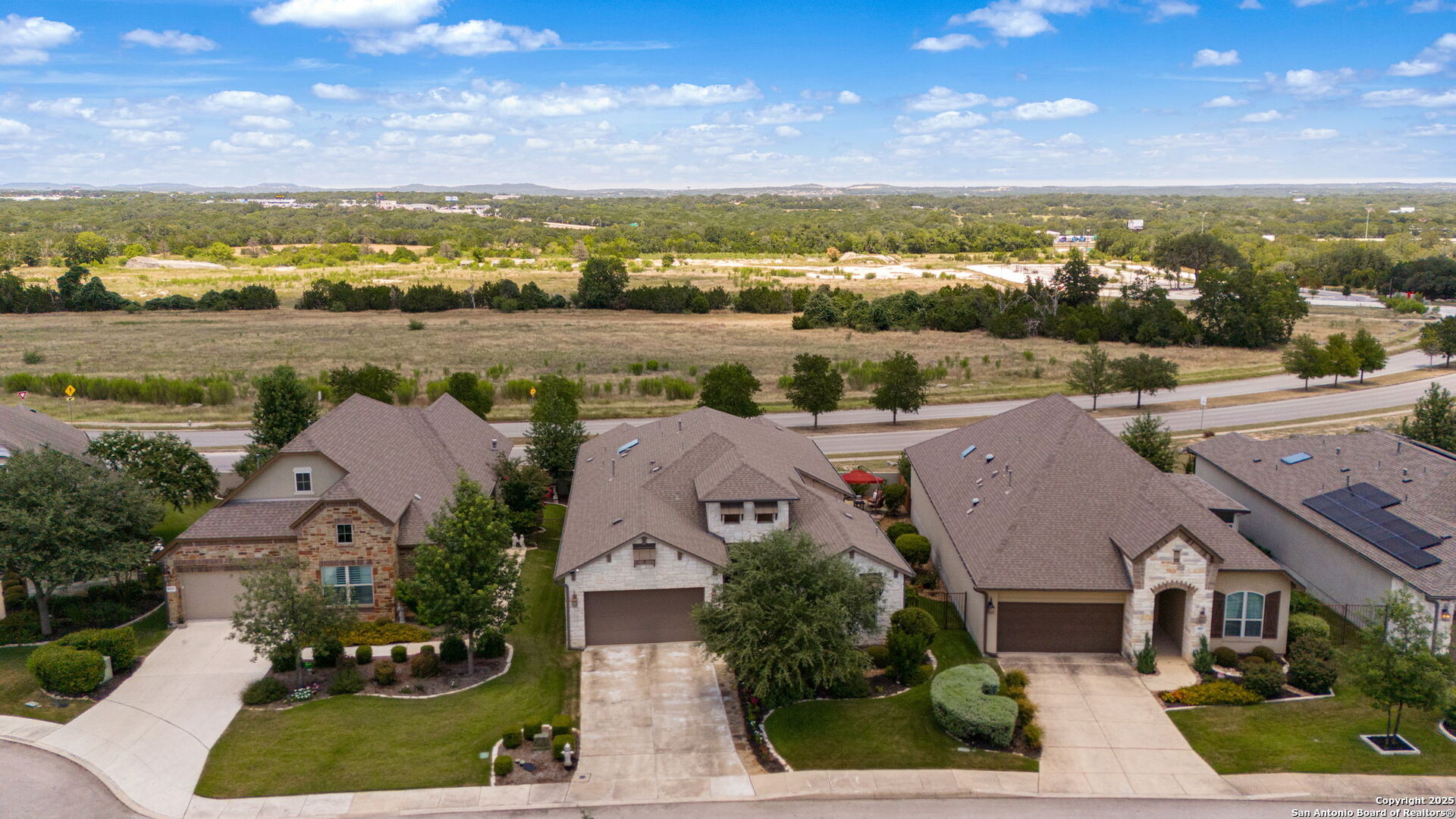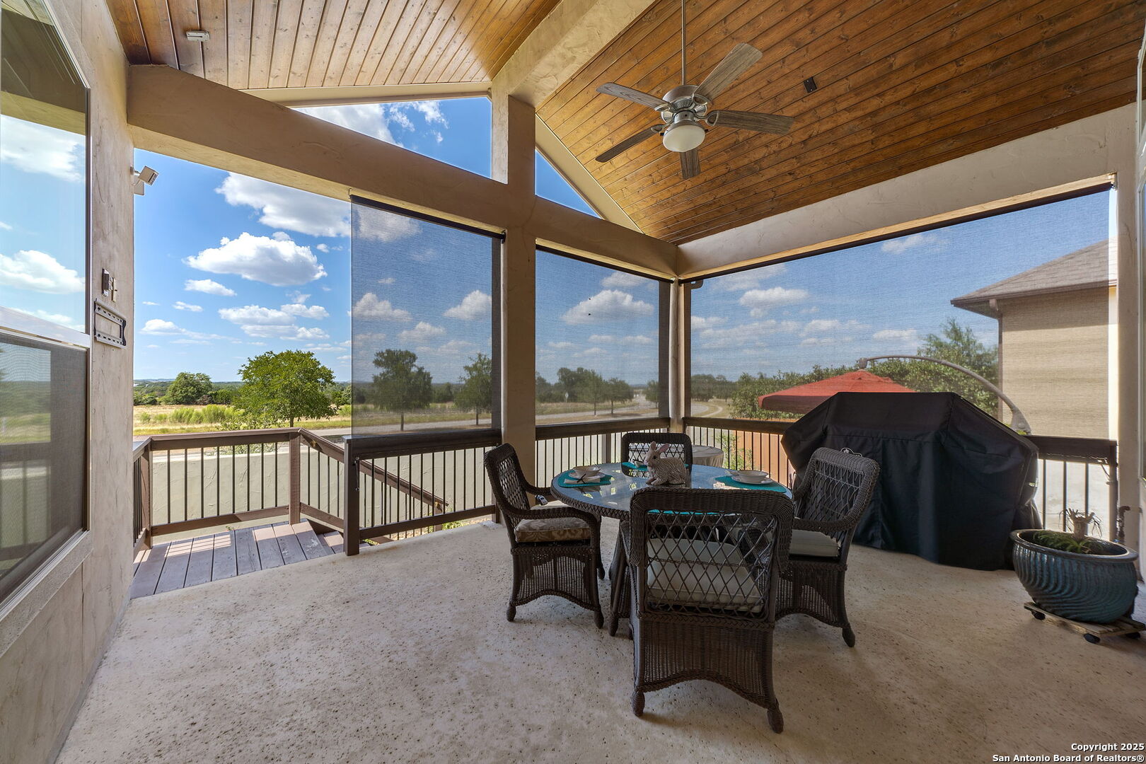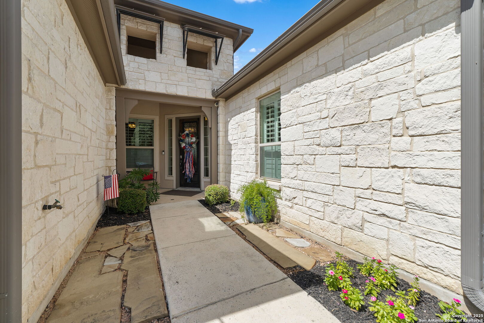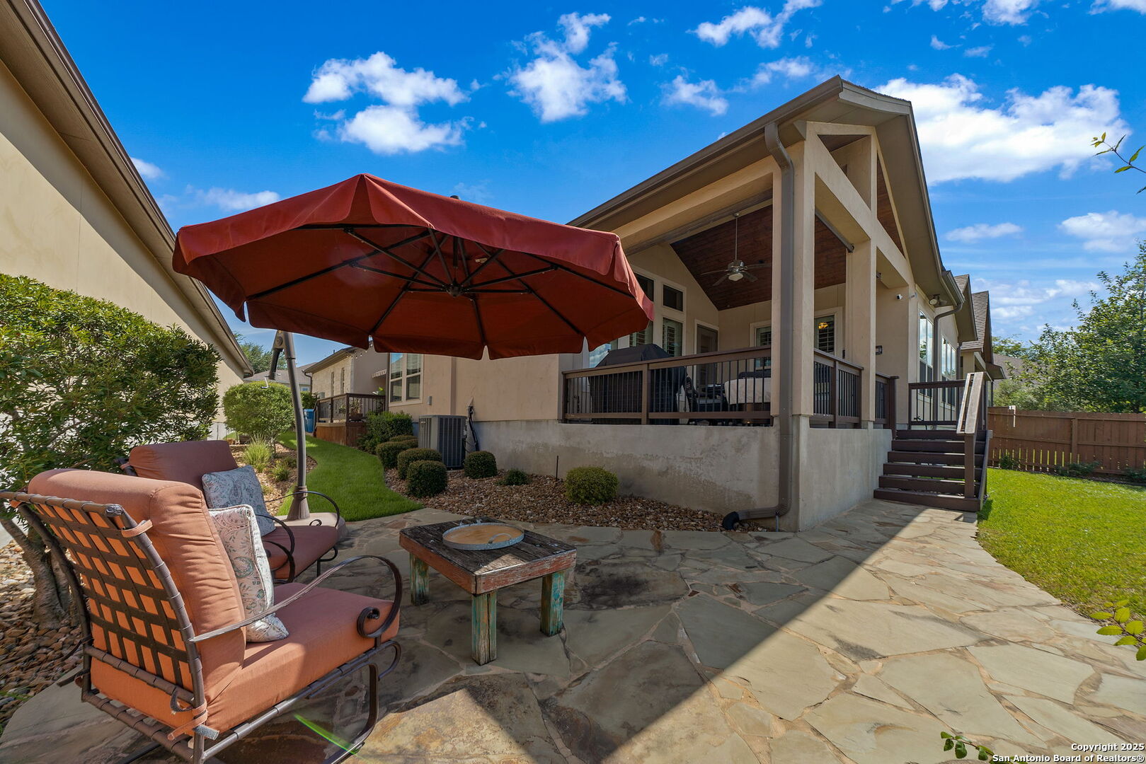 This wow home offers a residence with a lifestyle of owners choice. The home is located in the Gardens neighborhood of Balcones Creek, where meticulously manicured front and back yards are tended by the HOA. This Sitterle Home has many custom features unique to this home, including a vacuum system, a deck off the foyer with glass door that opens to composite deck which has a remote controlled Sun Setter awning. The deck leads to the side of the house where the trash cans are outside-no need to keep the trash cans inside the garage. The back porch is extended and includes a ceiling fan, sun screens, upgraded wood ceiling, is plumbed for gas grilling, and has a cable outlet. Step inside to an open floor plan. The foyer boasts a striking barrel ceiling accented with striking multi color tile on the archway opening into the family room. Beautiful tile spans the floors throughout the main areas and wet areas. Master bedroom and closet have carpet, and the other two bedrooms have recently installed wood flooring. The kitchen features an extra-large kitchen island, great for gatherings and culinary creations, gas cooking, double ovens, beverage fridge, reverse osmosis and stainless steel appliances, walk in pantry, custom cabinets, pull trash cabinet and under cabinet lighting. The high ceilings create an airy ambiance throughout and combine the open family living area featuring a rock, gas fireplace; the family room is prewired for home theatre and has a floor electrical outlet. Extra wide white plantation shutters adorn most windows. The split floor plan features each spacious bedroom as a private retreat. The master bath has extra cabinetry, spacious walk in shower with a bench, and is plumbed for a tub (no tub) plus the master closet has extra built in cabinets for linen or clothing storage. This home offers multiple outdoor living for fun family and friend gatherings Unwind, laugh, relax right at home inside or out. The home includes a study customized with built in book cases, cabinetry, pull out for hidden printer, file drawers and two knee workspaces. Also included is a flat driveway, widen for guest parking, three-car tandem garage, with rubbermaid shelving and fast track garage rail plus overhead garage storage. offering ample space for vehicles, storage, and more. Added are extra floodlights in the back and Christmas light package on the two front corners. The gated community includes flock cameras, an active COPS volunteer program, a Jr. Olympic pool, clubhouse, children's play area, and is just minutes from Boerne and at least five minutes to HEB Fair Oaks. Compare with other similar Garden Sitterle homes, and this is priced to sell. Lock and Go!