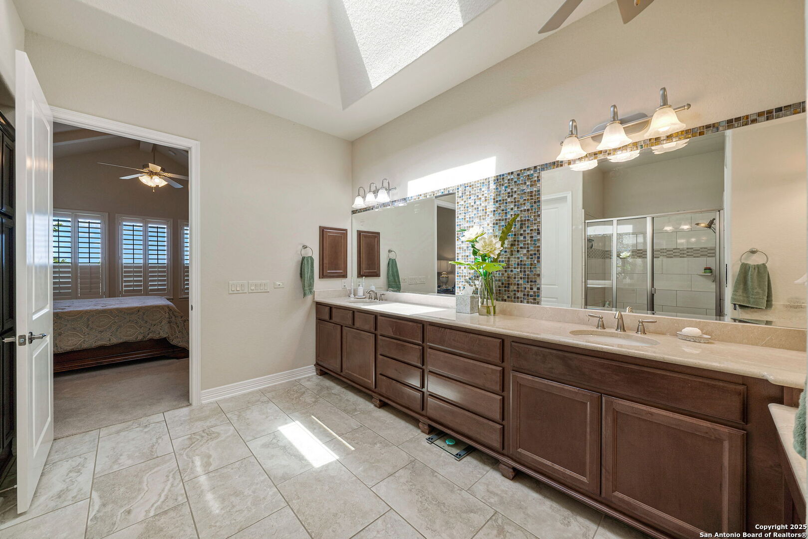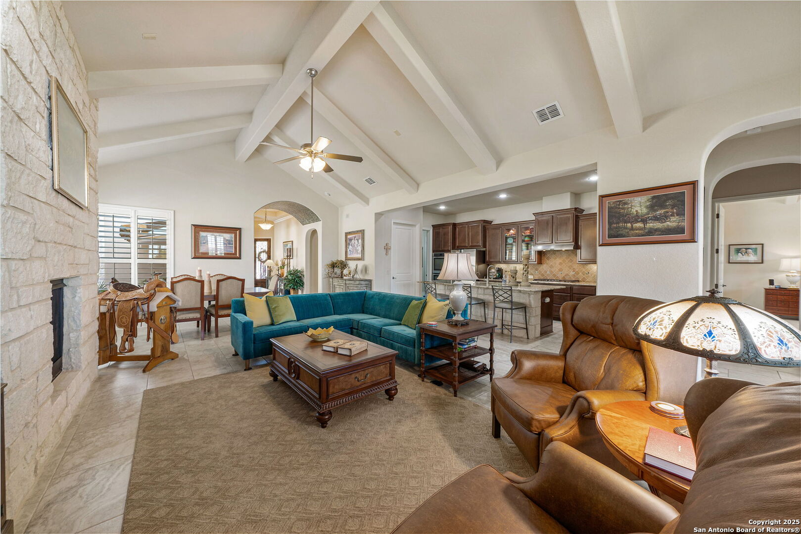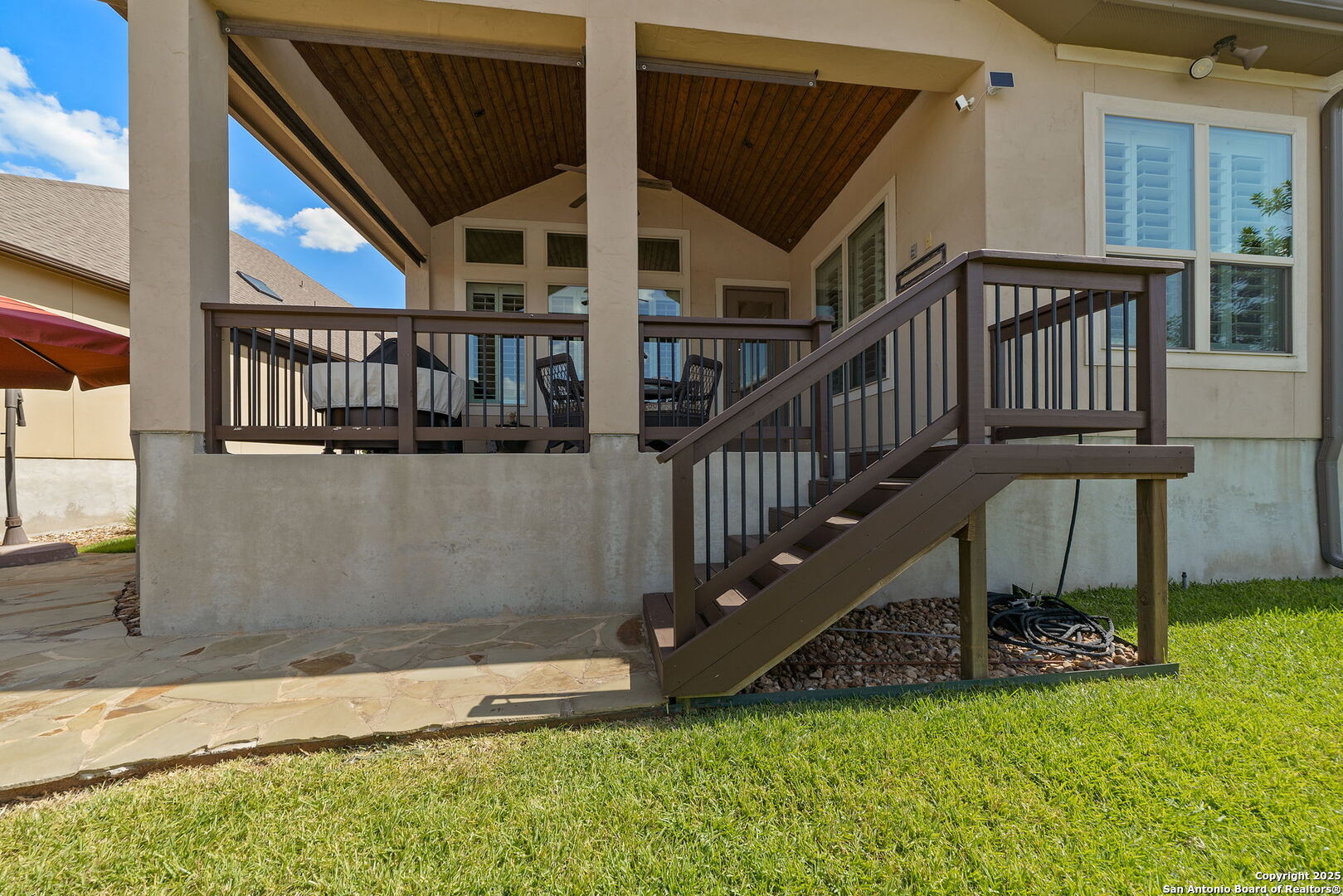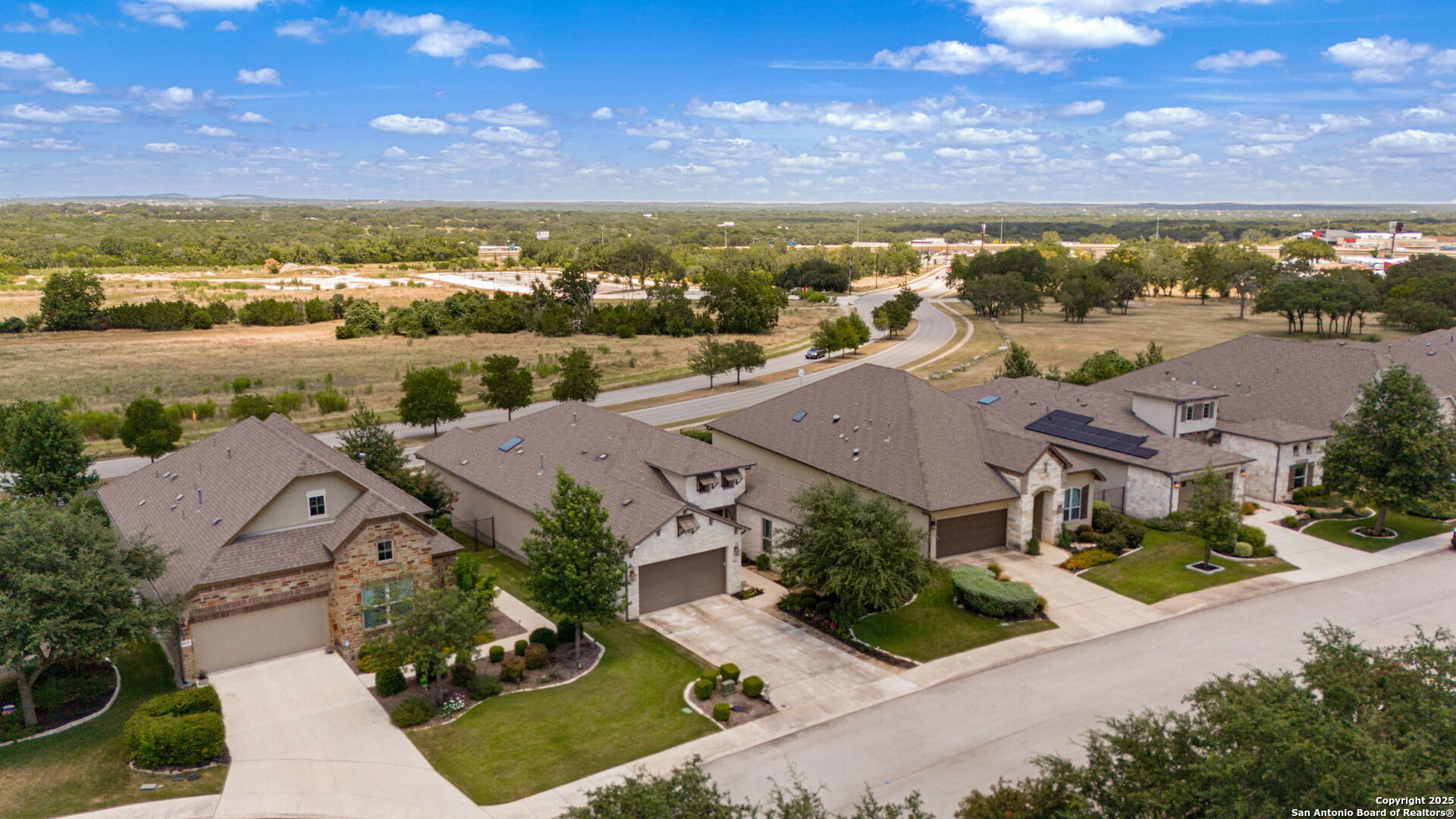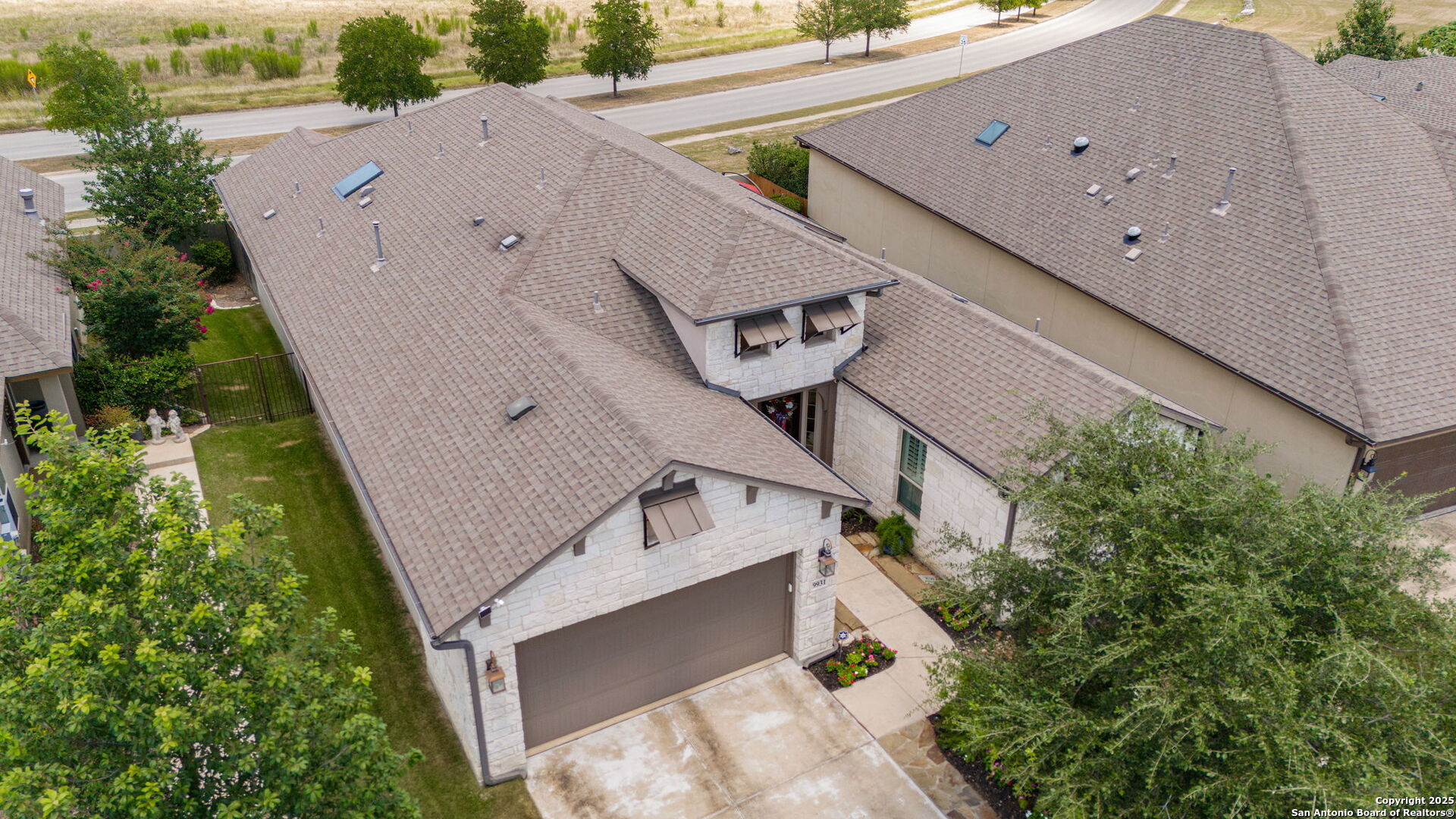 This wow home offers a residence with a lifestyle of owners choice. The home is located in the Gardens neighborhood of Balcones Creek, where meticulously manicured front and back yards are tended by the HOA. This Sitterle Home has many custom features unique to this home, including a vacuum system, a deck off the foyer with glass door that opens to composite deck which has a remote controlled Sun Setter awning. The deck leads to the side of the house where the trash cans are outside-no need to keep the trash cans inside the garage. The back porch is extended and includes a ceiling fan, sun screens, upgraded wood ceiling, is plumbed for gas grilling, and has a cable outlet. Step inside to an open floor plan. The foyer boasts a striking barrel ceiling accented with striking multi color tile on the archway opening into the family room. Beautiful tile spans the floors throughout the main areas and wet areas. Master bedroom and closet have carpet, and the other two bedrooms have recently installed wood flooring. The kitchen features an extra-large kitchen island, great for gatherings and culinary creations, gas cooking, double ovens, beverage fridge, reverse osmosis and stainless steel appliances, walk in pantry, custom cabinets, pull trash cabinet and under cabinet lighting. The high ceilings create an airy ambiance throughout and combine the open family living area featuring a rock, gas fireplace; the family room is prewired for home theatre and has a floor electrical outlet. Extra wide white plantation shutters adorn most windows. The split floor plan features each spacious bedroom as a private retreat. The master bath has extra cabinetry, spacious walk in shower with a bench, and is plumbed for a tub (no tub) plus the master closet has extra built in cabinets for linen or clothing storage. This home offers multiple outdoor living for fun family and friend gatherings Unwind, laugh, relax right at home inside or out. The home includes a study customized with built in book cases, cabinetry, pull out for hidden printer, file drawers and two knee workspaces. Also included is a flat driveway, widen for guest parking, three-car tandem garage, with rubbermaid shelving and fast track garage rail plus overhead garage storage. offering ample space for vehicles, storage, and more. Added are extra floodlights in the back and Christmas light package on the two front corners. The gated community includes flock cameras, an active COPS volunteer program, a Jr. Olympic pool, clubhouse, children's play area, and is just minutes from Boerne and at least five minutes to HEB Fair Oaks. Compare with other similar Garden Sitterle homes, and this is priced to sell. Lock and Go!