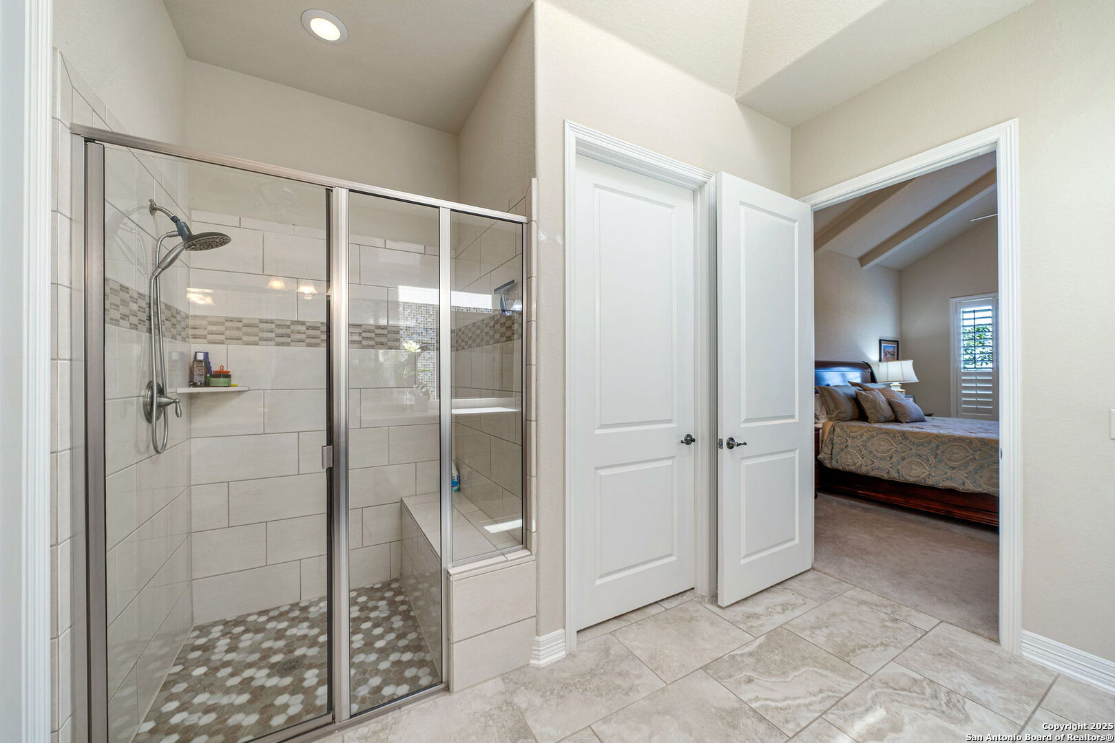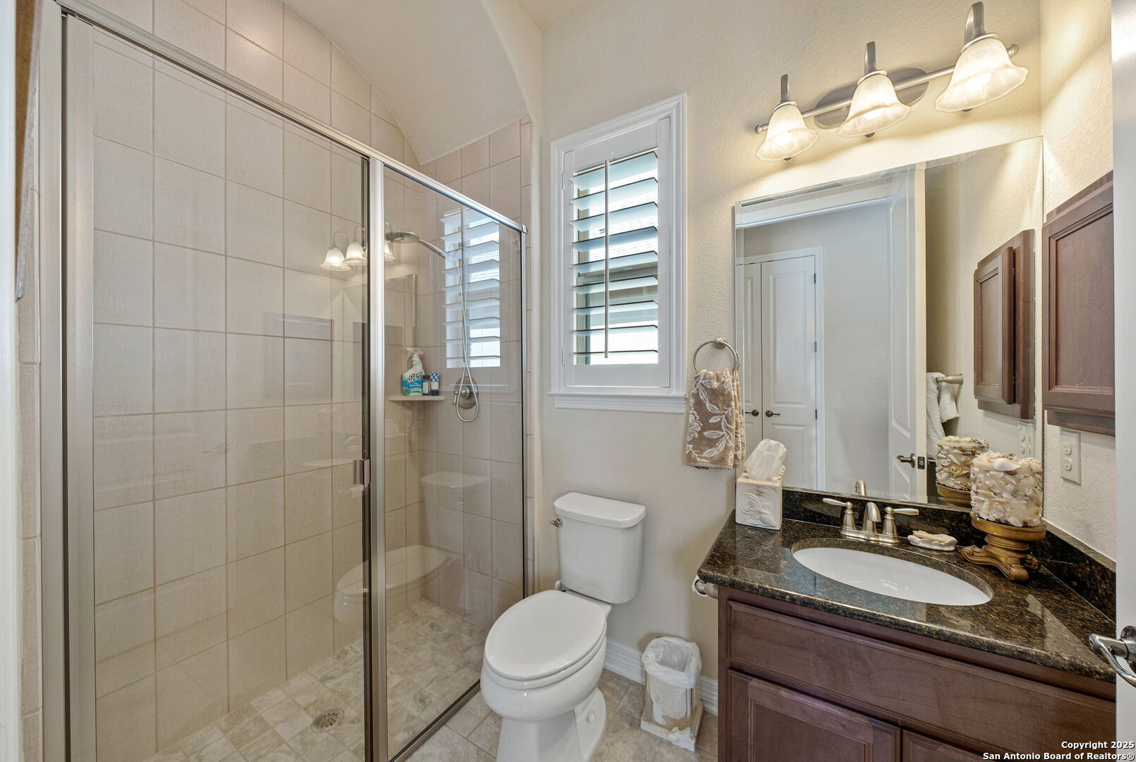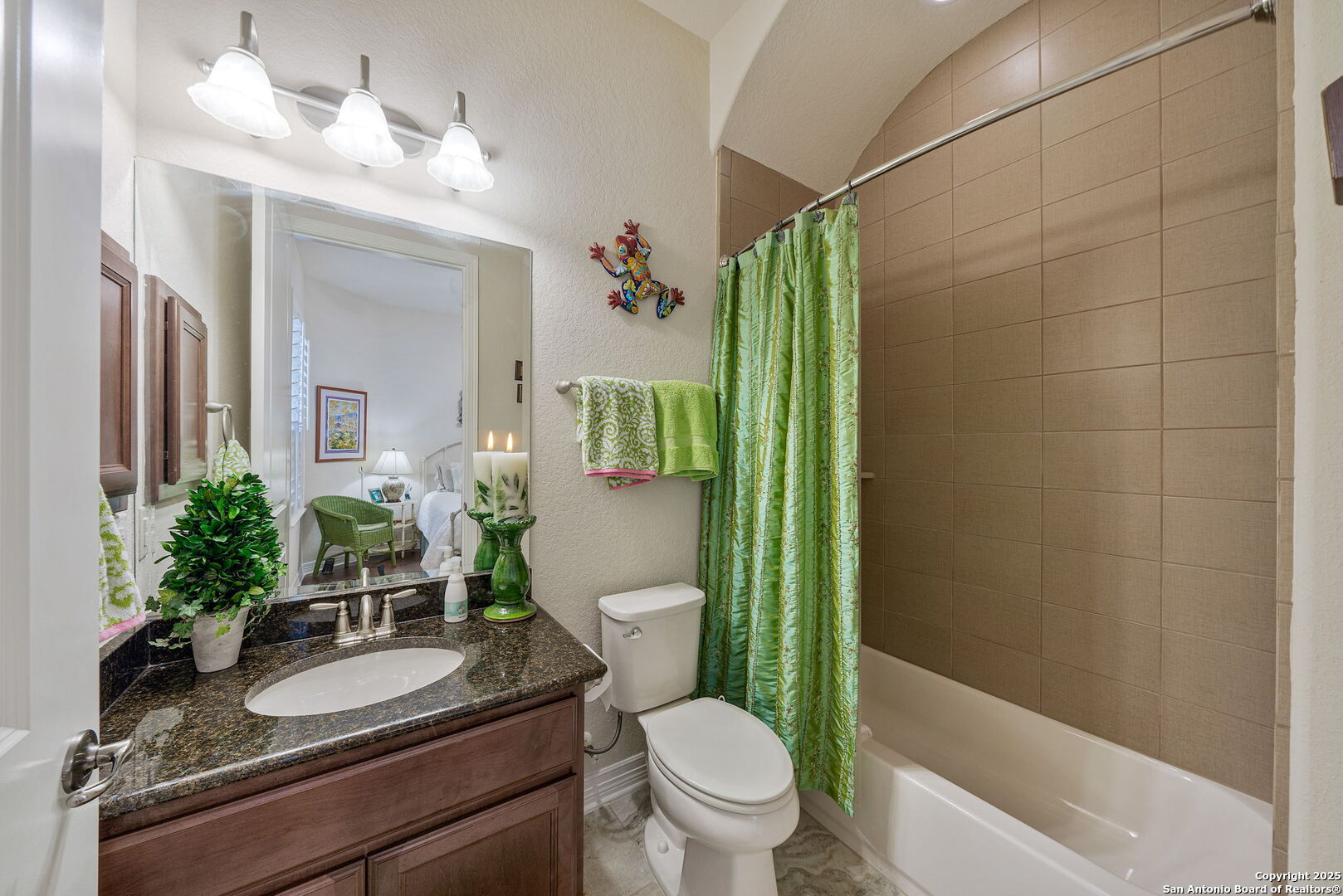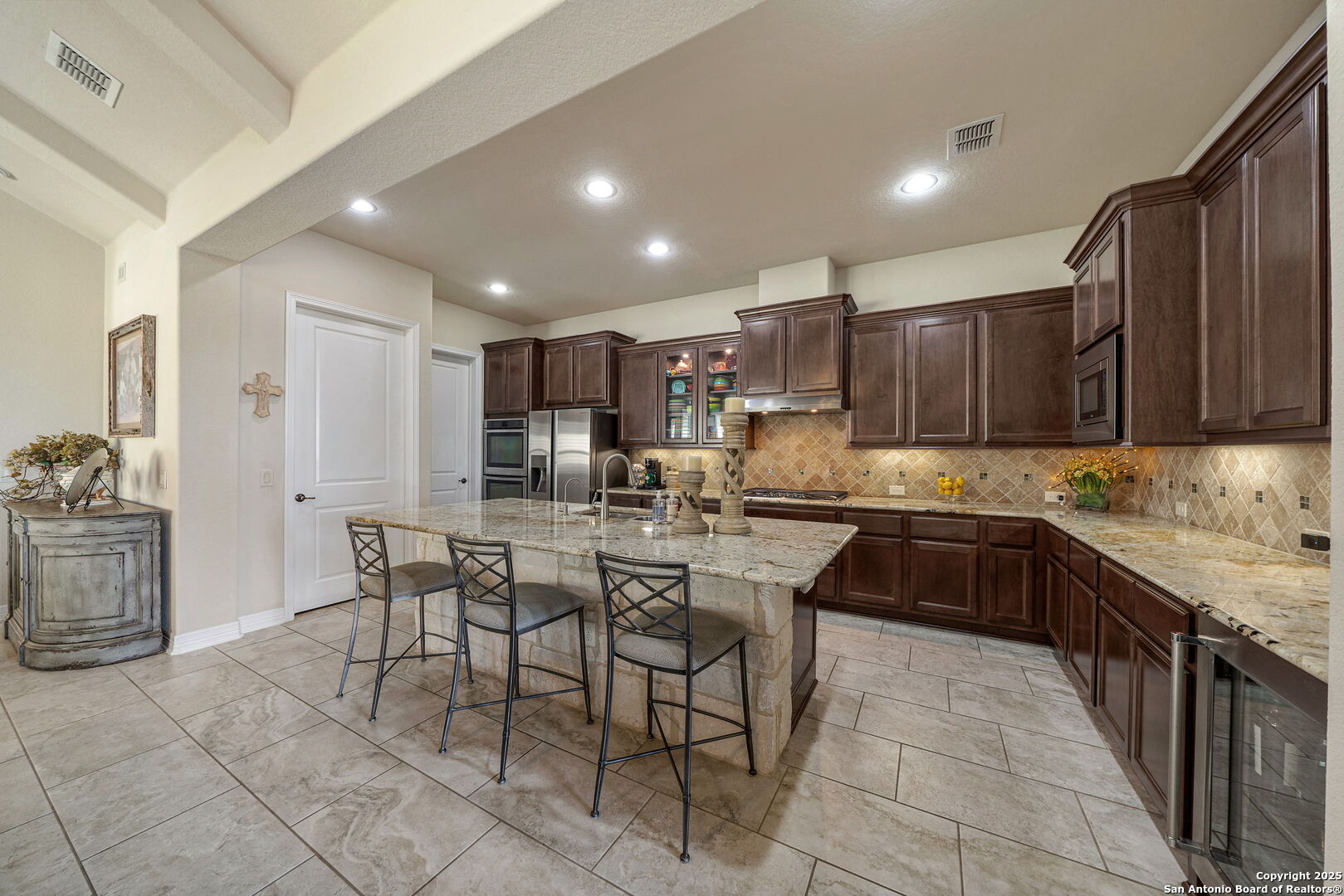 This wow home offers a residence with a lifestyle of owners choice. The home is located in the Gardens neighborhood of Balcones Creek, where meticulously manicured front and back yards are tended by the HOA. This Sitterle Home has many custom features unique to this home, including a vacuum system, a deck off the foyer with glass door that opens to composite deck which has a remote controlled Sun Setter awning. The deck leads to the side of the house where the trash cans are outside-no need to keep the trash cans inside the garage. The back porch is extended and includes a ceiling fan, sun screens, upgraded wood ceiling, is plumbed for gas grilling, and has a cable outlet. Step inside to an open floor plan. The foyer boasts a striking barrel ceiling accented with striking multi color tile on the archway opening into the family room. Beautiful tile spans the floors throughout the main areas and wet areas. Master bedroom and closet have carpet, and the other two bedrooms have recently installed wood flooring. The kitchen features an extra-large kitchen island, great for gatherings and culinary creations, gas cooking, double ovens, beverage fridge, reverse osmosis and stainless steel appliances, walk in pantry, custom cabinets, pull trash cabinet and under cabinet lighting. The high ceilings create an airy ambiance throughout and combine the open family living area featuring a rock, gas fireplace; the family room is prewired for home theatre and has a floor electrical outlet. Extra wide white plantation shutters adorn most windows. The split floor plan features each spacious bedroom as a private retreat. The master bath has extra cabinetry, spacious walk in shower with a bench, and is plumbed for a tub (no tub) plus the master closet has extra built in cabinets for linen or clothing storage. This home offers multiple outdoor living for fun family and friend gatherings Unwind, laugh, relax right at home inside or out. The home includes a study customized with built in book cases, cabinetry, pull out for hidden printer, file drawers and two knee workspaces. Also included is a flat driveway, widen for guest parking, three-car tandem garage, with rubbermaid shelving and fast track garage rail plus overhead garage storage. offering ample space for vehicles, storage, and more. Added are extra floodlights in the back and Christmas light package on the two front corners. The gated community includes flock cameras, an active COPS volunteer program, a Jr. Olympic pool, clubhouse, children's play area, and is just minutes from Boerne and at least five minutes to HEB Fair Oaks. Compare with other similar Garden Sitterle homes, and this is priced to sell. Lock and Go!