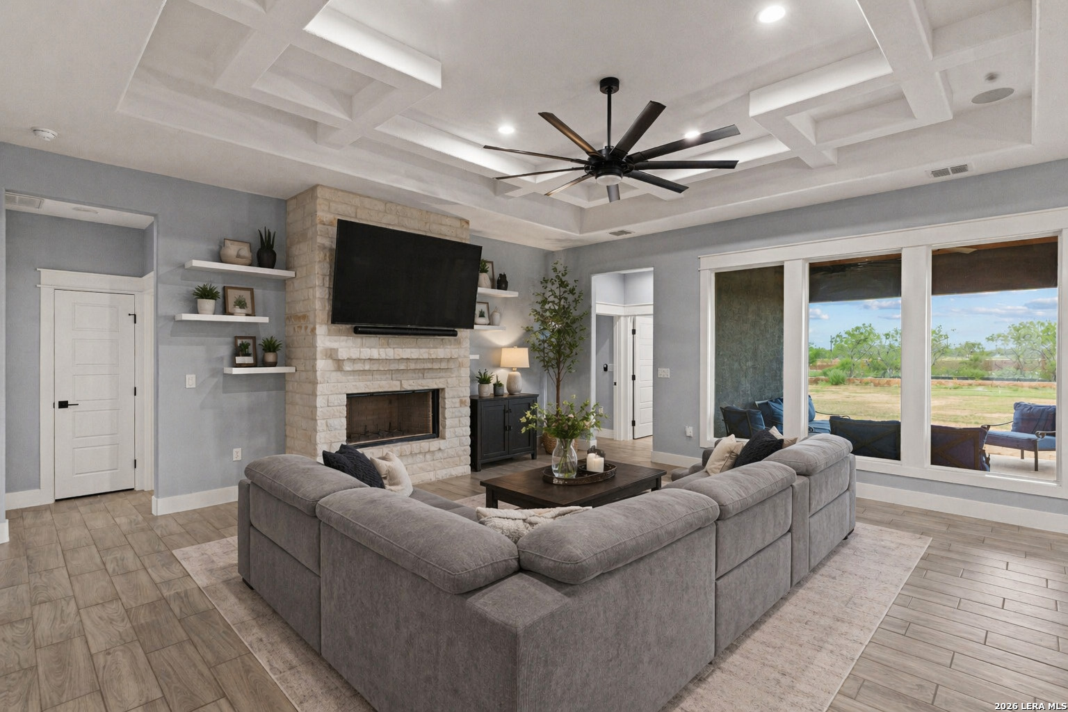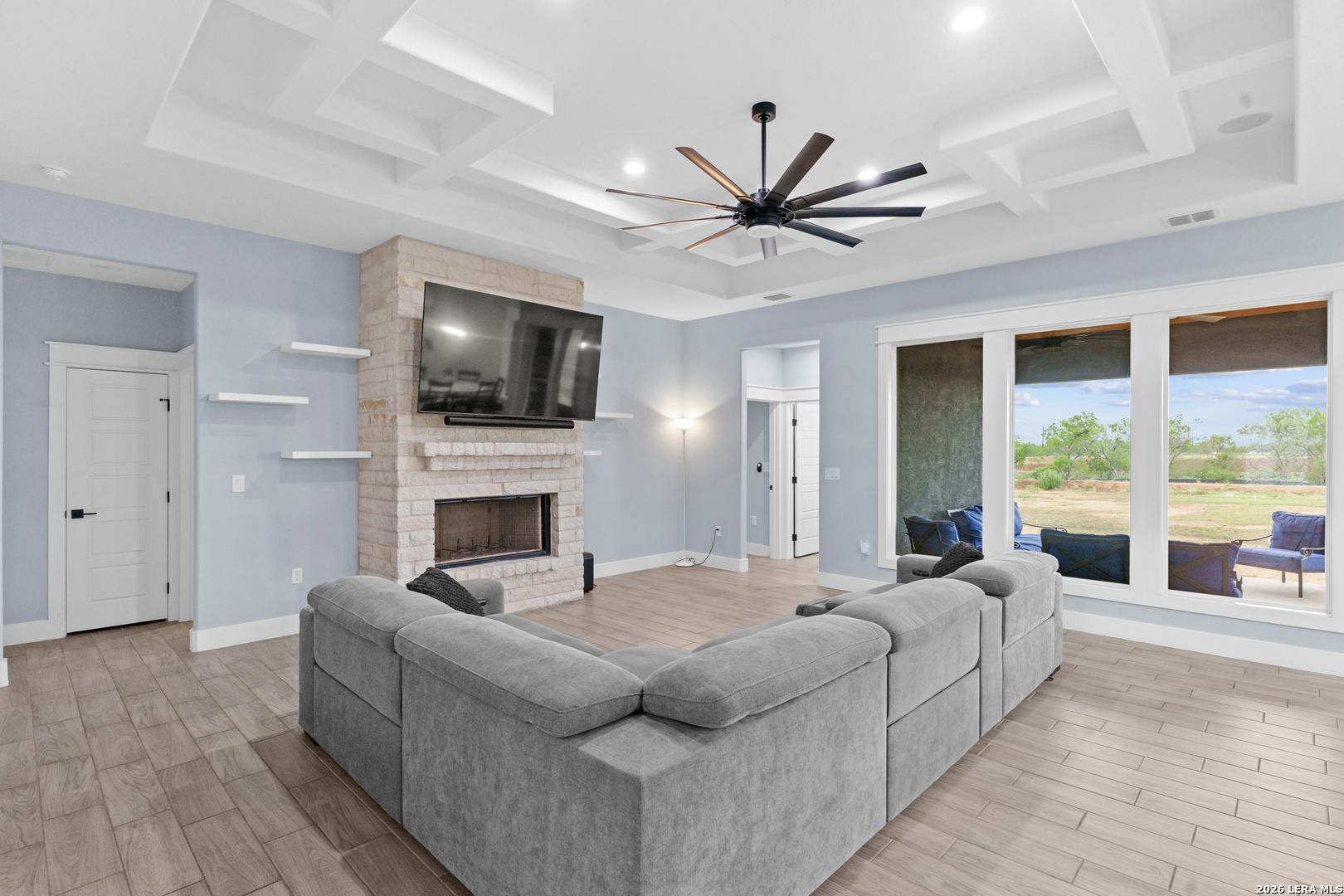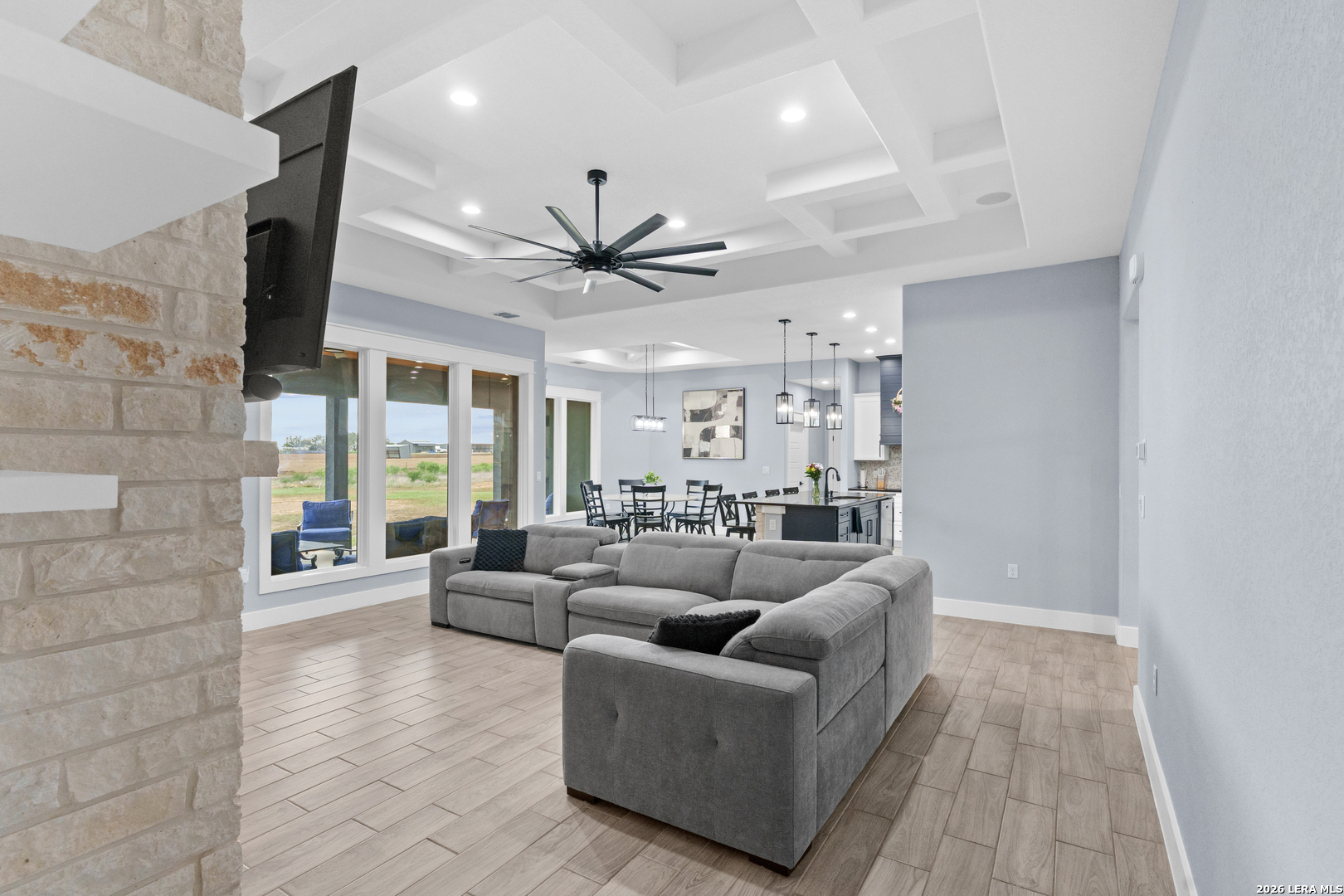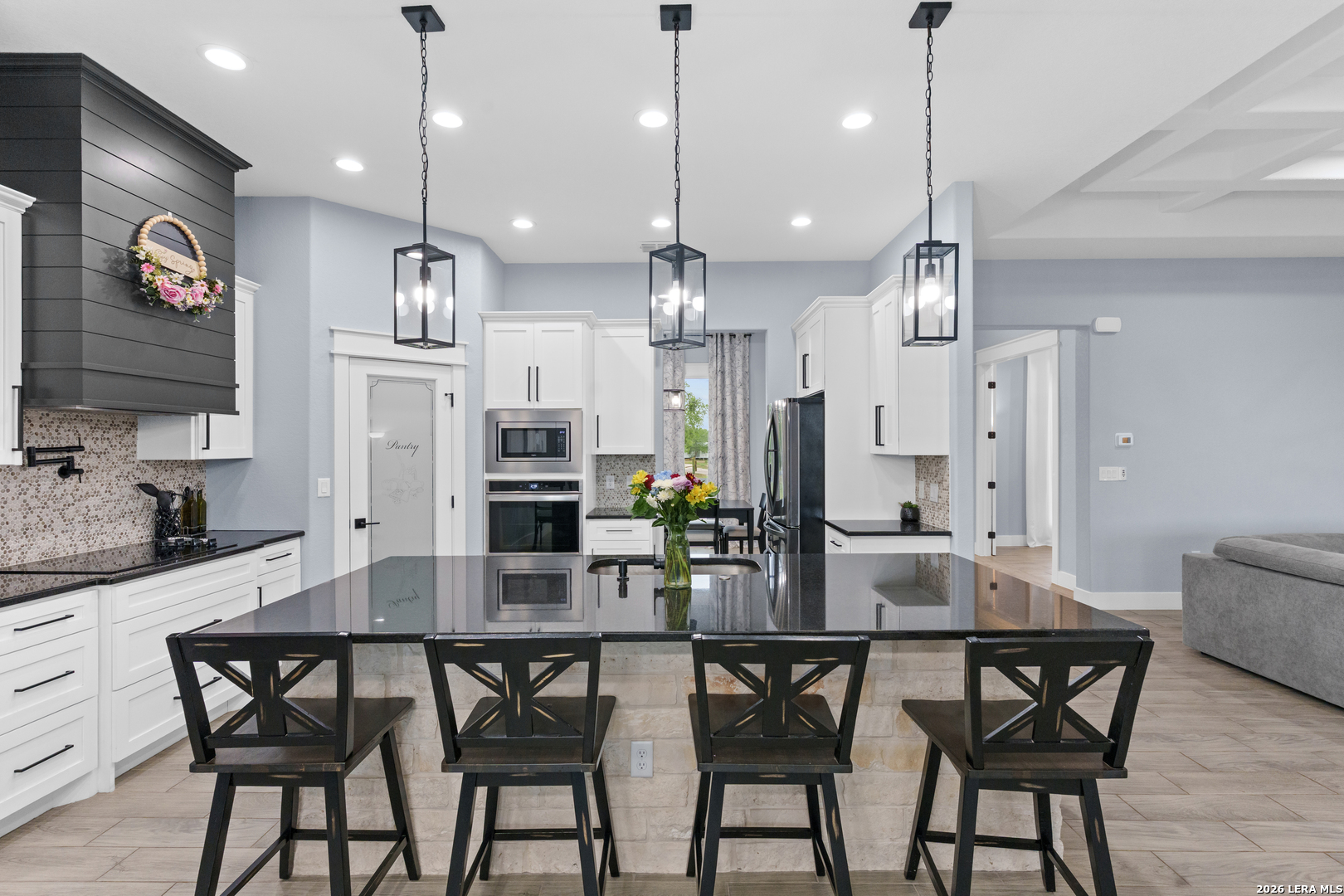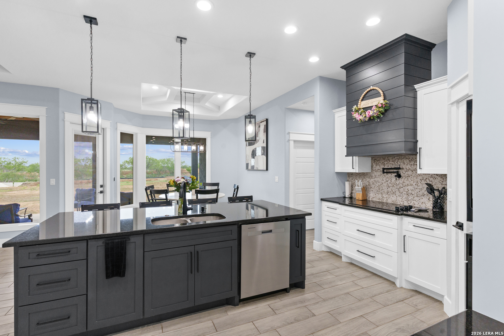 Welcome to this stunning modern contemporary home built in 2023, where style and functionality come together seamlessly. Designed with comfort in mind, this beautifully crafted residence features a level floor plan with no steps and elegant wood-look tile flooring throughout, completely carpet-free for easy maintenance. The spacious living room showcases a cozy wood-burning fireplace, complemented by sleek modern light fixtures, recessed lighting, and striking propeller-style ceiling fans with remote controls. You'll love the sophisticated trey ceiling designs that elevate nearly every room. The chef-inspired kitchen is a true centerpiece, boasting a large island, built-in stovetop, oven, and microwave, a custom range hood, and a convenient pot filler, perfect for everyday living and entertaining, along with gorgeous custom cabinetry throughout. The expansive primary suite offers a luxurious retreat with a spa-like bathroom featuring a modern walk-in shower with dual shower heads, including a waterfall feature, plus a generously sized closet. Additional highlights include a laundry room with a utility sink and a stylish backyard patio complete with a wood ceiling and fan, ideal for relaxing or hosting guests. This exceptional home is available as the sellers relocate for work, don't miss your opportunity to make it yours. Seller's are relocating due to work and will greatly miss this well-loved and maintained home.
