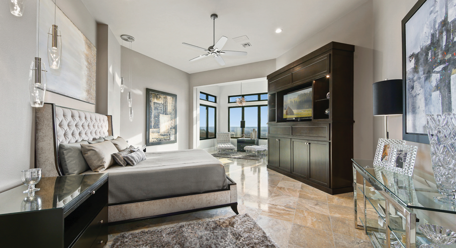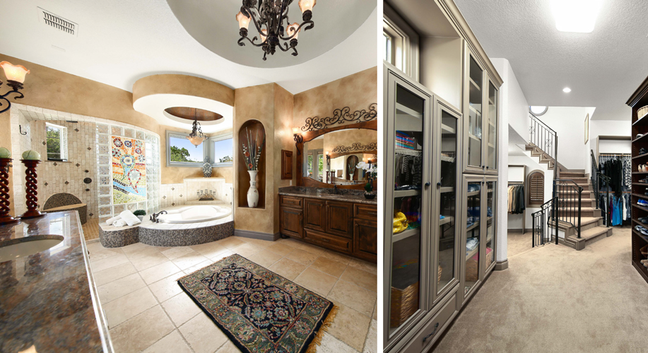 The master wing boasts a sitting area, seamless glass windows and outside access to pools and spa. The spa inspired bath includes a jetted tub, walk-in shower, separate vanities, breakfast bar and a tri-level boutique dressing room with glass cabinets, custom shelves and a cedar closet.