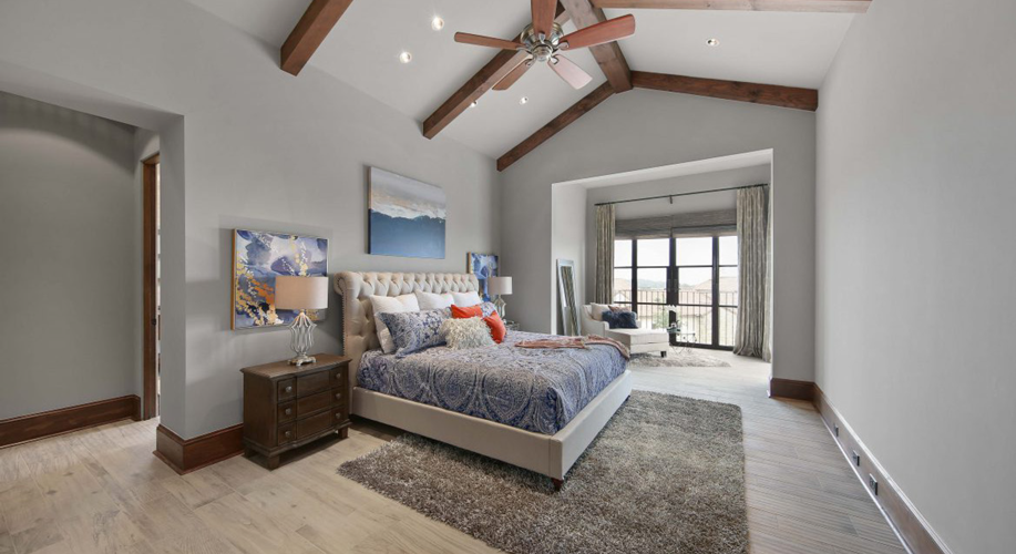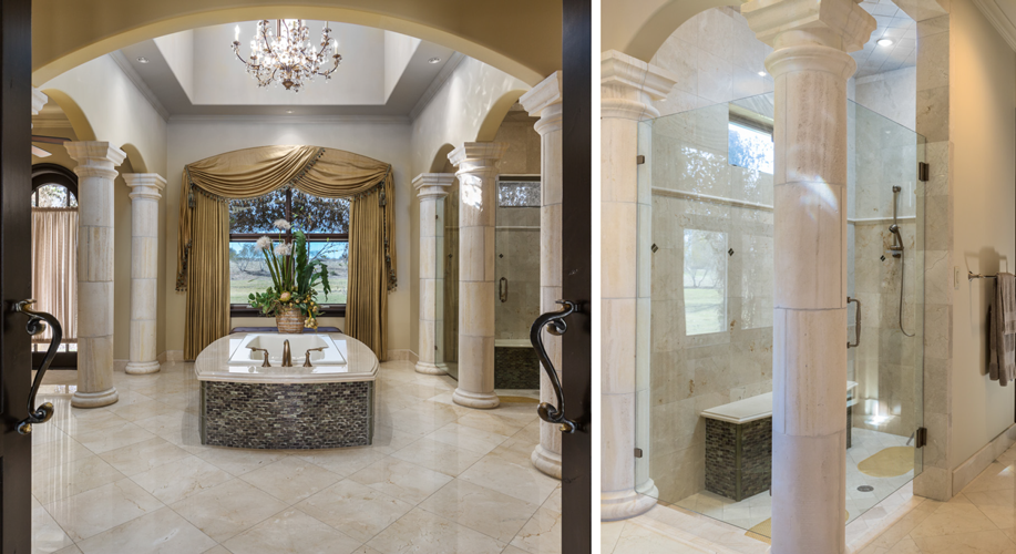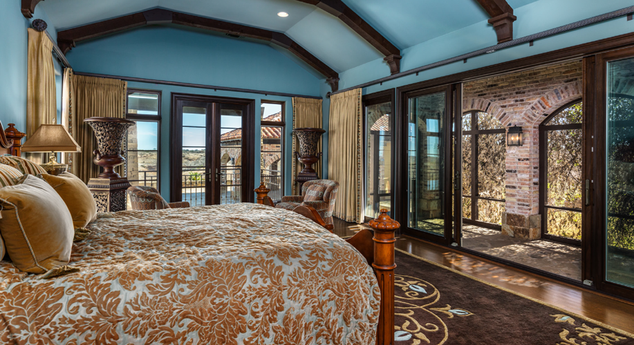 This contemporary hilltop jewel designed by Roy Braswell offers the utmost elegance. The spacious master bedroom showcases a gorgeous wood beamed ceiling and sitting area, while the master bathroom incorporates wood, glass and iron elements, and looks out over the rolling Hill Country.