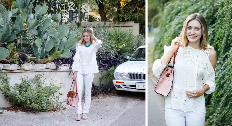 Crisp autumn mornings, oversized sweaters and pumpkin spiced everything just to name a few ways to cherish the beginning of fall. The summer's heat has finally begun to melt away in the Hill Country and fall transition fashion is welcomed with open arms by women city-wide. This year in fashion continues to offer darling trends which make a seamless transformation into fall. In celebration of the weather cooling down, I decided to showcase a few San Antonio boutiques and share my favorite finds. I started my shopping at Camilla Crown, which is an ultra-chic boutique located off 1604. The store is crisp and colorful; filled with elegant and unique pieces that speak for themselves. Not only did I find this white lacey blouse I couldn’t leave without, but I was mesmerized by the myriad of gemstones and dainty pendants adorning the counters. The store is one-of-a-kind in every way, from local purses to trendy blouses and eye-catching jewel accessories.