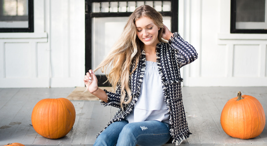My final destination was to the one and only Dienger Trading Co., as you know it's one of my all-time favorite stops. I always start my shopping in the store by grabbing a warm latte to sip on while I meander through the store. They have some irresistible pieces to layer which is exactly how I ended up with this beautiful Jacquard jacket. The jacket is mainly black and white with hues of amethyst that somehow goes with everything. I paired it here with one of my favorite summer blouses and ripped jeans to easily adjust to the fluctuating weather during the day. This piece is chic and the perfect layer to wear to class or a meeting in the evening when you don't want to be completely bundled up. Not only does this jacket pair easily with my summer and fall blouses but it steps away from mainstream style which can be so much fun. Now I am just keeping my eye out for a felt hat to pair with it!