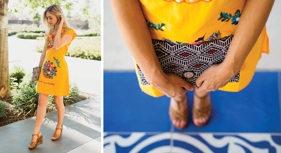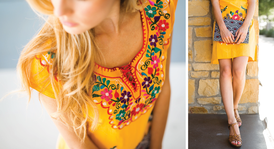 If you are looking for a more traditional look, bold colors and floral embroidery are a safe start. Since yellow is not usually a color I parade, I decided to give it a try for Fiesta. The loose fitting style is perfect for Oyster Bake and NIOSA (Night in Old San Antonio) where food is as abundant as appetites. This style of dress is wonderful because not only is it Fiesta approved, but they can be dressed up or dressed down depending on your personal preference. Since I take advantage of any opportunity to boost my height, I paired the look with some neutral wedges and a Huipil Market clutch for major Spring vibes.
