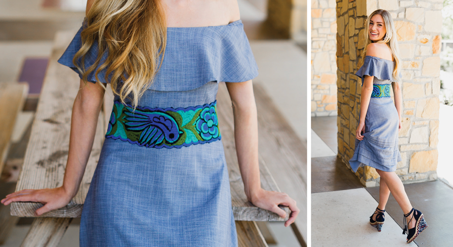 The final look I crafted is ideal when you have your heart set on wearing a specific piece but aren't sure how to tie it in with the Fiesta theme. Here, I purchased this Chambray off-shoulder dress and accessorized it with a floral stitched belt. If you haven't found quite the outfit you'd like for the celebrations, accessories can be your best friend. I added these Elaine Turner earrings to complete my look.