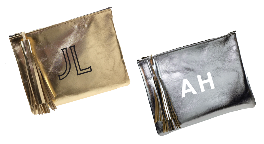 For the lady in your life, there are several luxurious adornments that can be personalized. This gold, supple leather, handmade clutch by Parker Thatch will be her go-to bag. It features a double tassel pull and can be personalized with her initials in black. Some styles offer white block lettering.