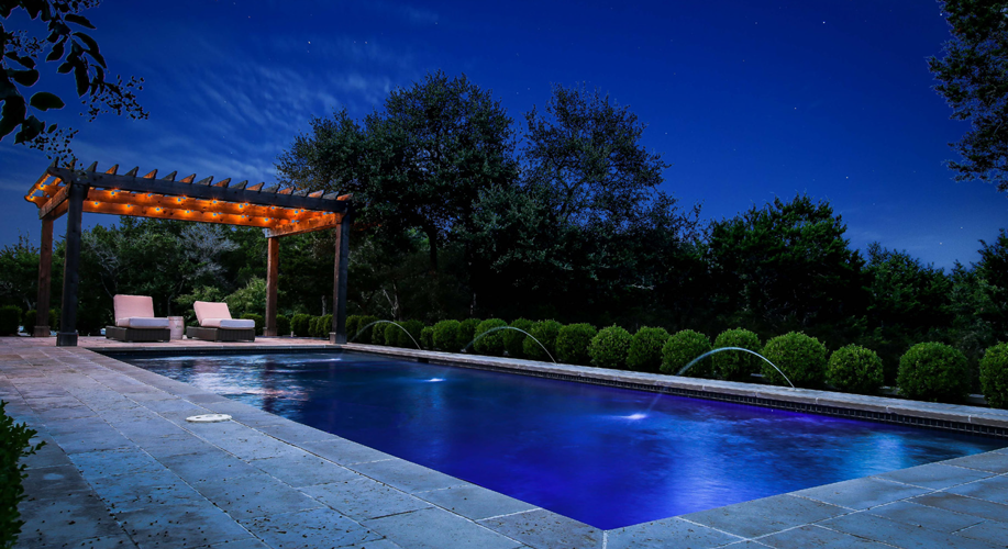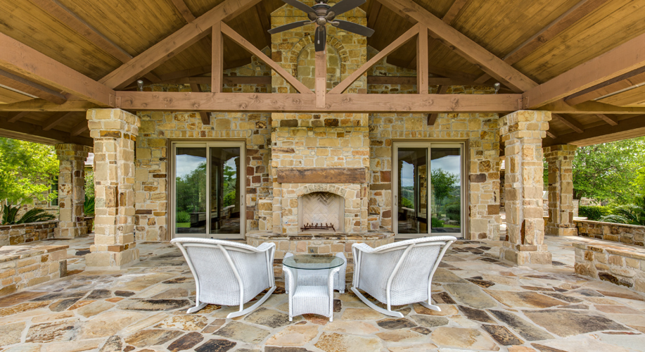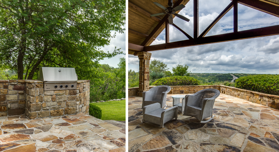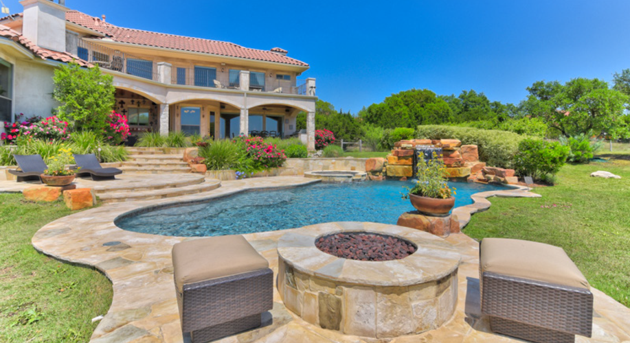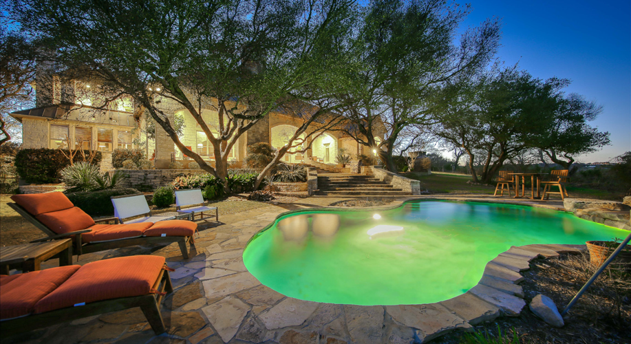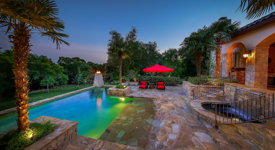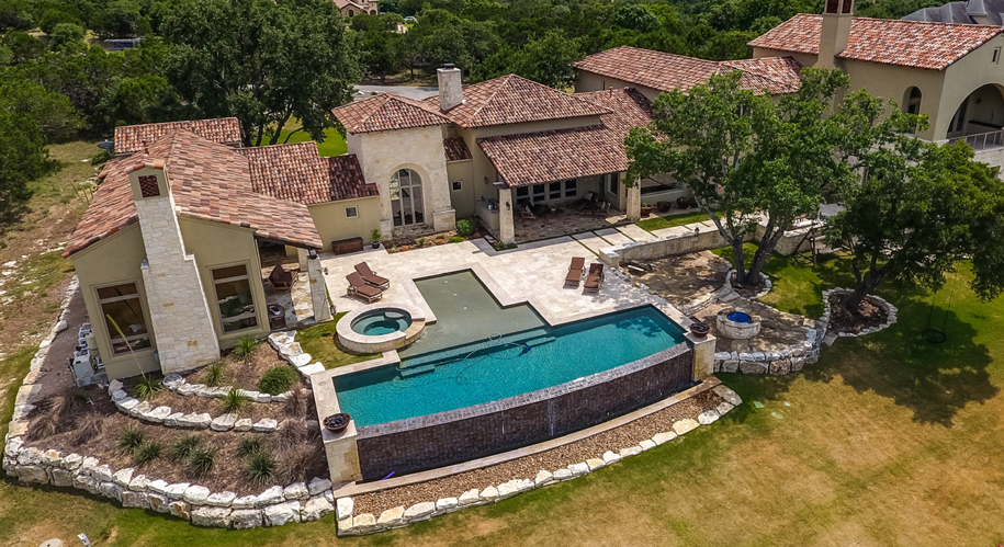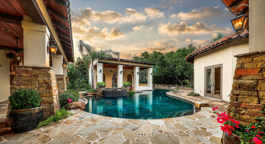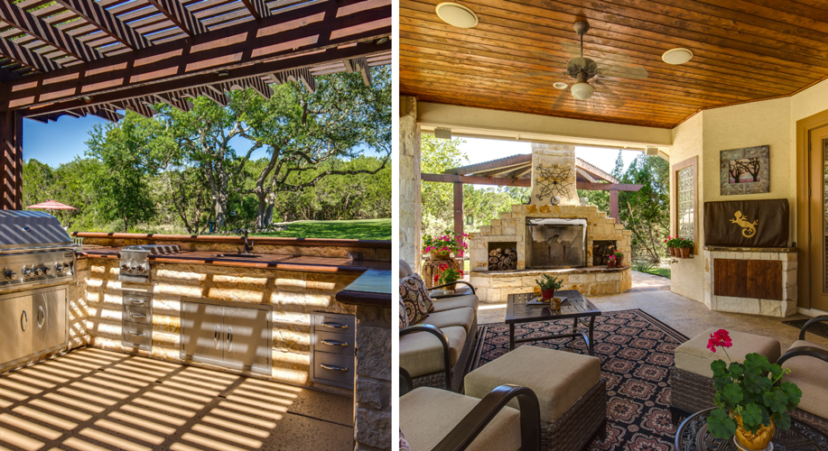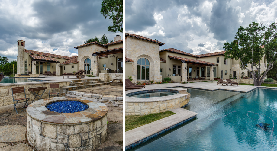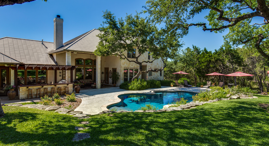 Stately French Country home boasts privacy, Hill Country views and grounds ideal for entertaining with an outdoor space consisting of a fireplace, pergola and stunning pool with water features.