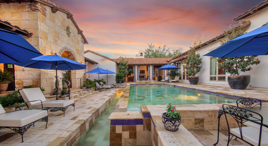 This one-story entertainment destination offers a magnificent Keith Zars pool and spa. At night, enjoy the evening under your covered patio next to the outdoor fireplace.