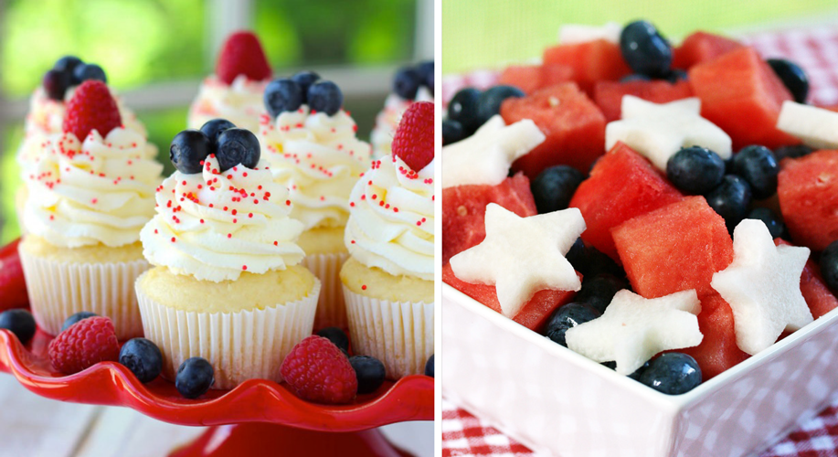 • Garnish homemade or store-bought, vanilla cupcakes with strawberry and blueberry toppers.