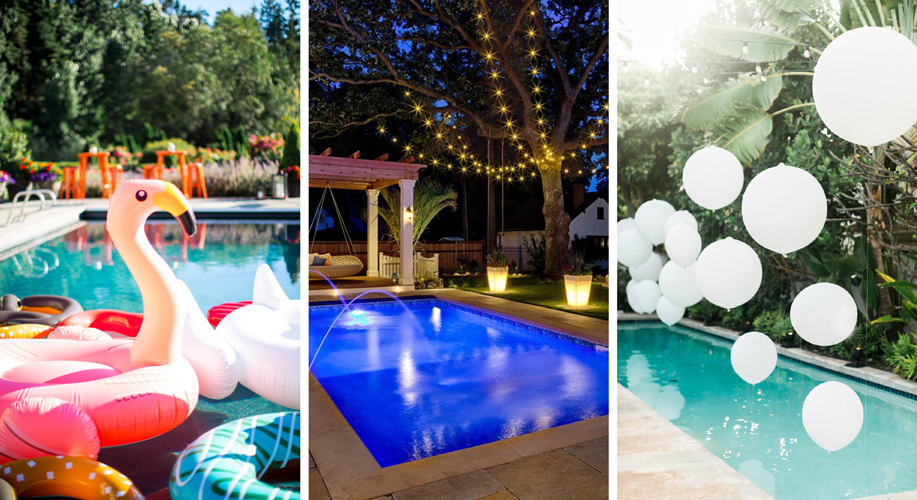 • Tie weights to the ends of the strings of colorful balloons and sink them in the pool. The balloons will float above the water and add movement to your poolside decor. You could also add a light inside the balloon to add some extra glow to your evening pool party.