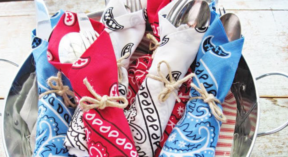 • Impress your guests with a festive red, white and blue table setting. Use a white tablecloth with a blue runner, accompanied by red western bandanas in place of napkins.