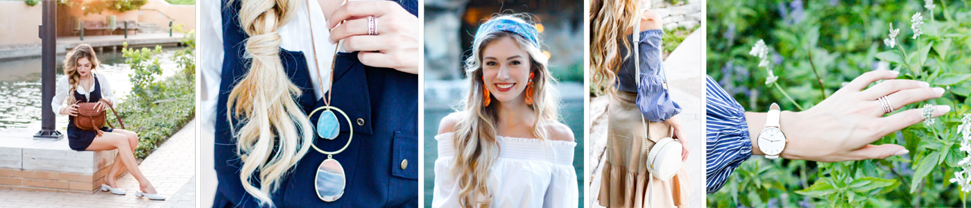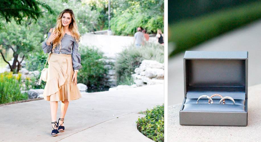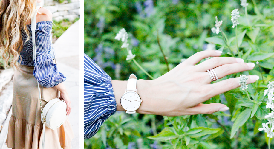 My first look was a striped off-the-shoulder blouse with a ruffled beige skirt. I accessorized it with my Elaine Turner “Shelly in Snake” bag which is the perfect sized bag for summer travels. It’s big enough to fit my necessities (and a few other not-so-necessary items) but doesn’t take over my entire side like some of my favorite winter totes do. I also wore my Daniel Wellington petite watch and my new favorite stackable rings.