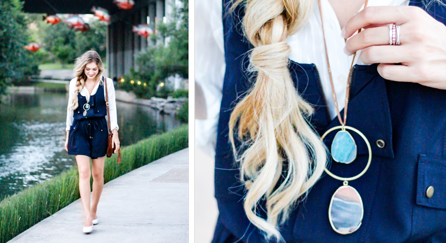 My second outfit is what I call my modern day “Belle” look. It reminds me of Belle from Beauty and the Beast when she is singing in the hill tops. This romper is super lightweight and doesn’t have any uncomfortable elastic on your waist. Instead it has a drawstring you can adjust to whatever size you prefer. I really love the length of the shorts and that I can pair a variety of blouses underneath to change it up. I also wore an oversized boho necklace from Anthropologie to break up the solid navy romper.
