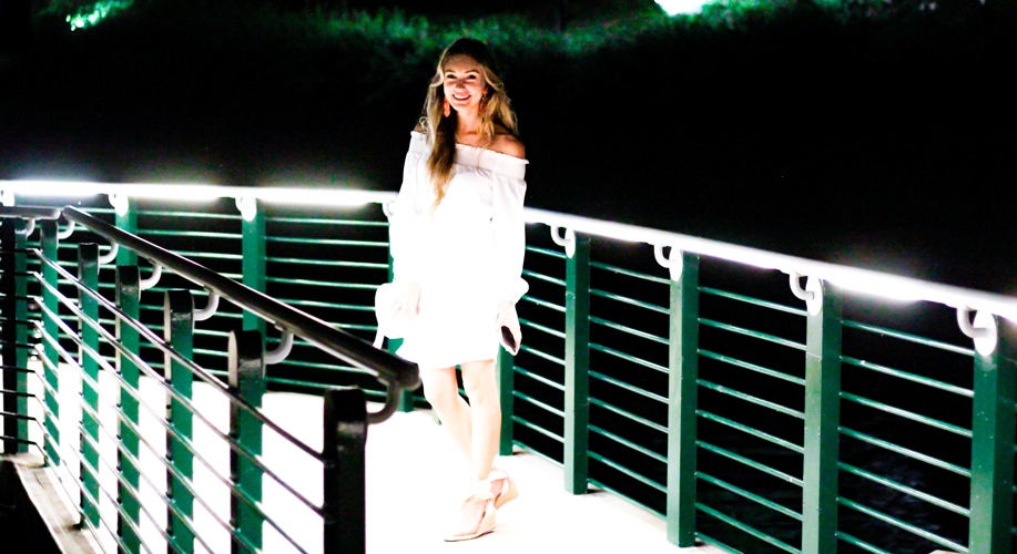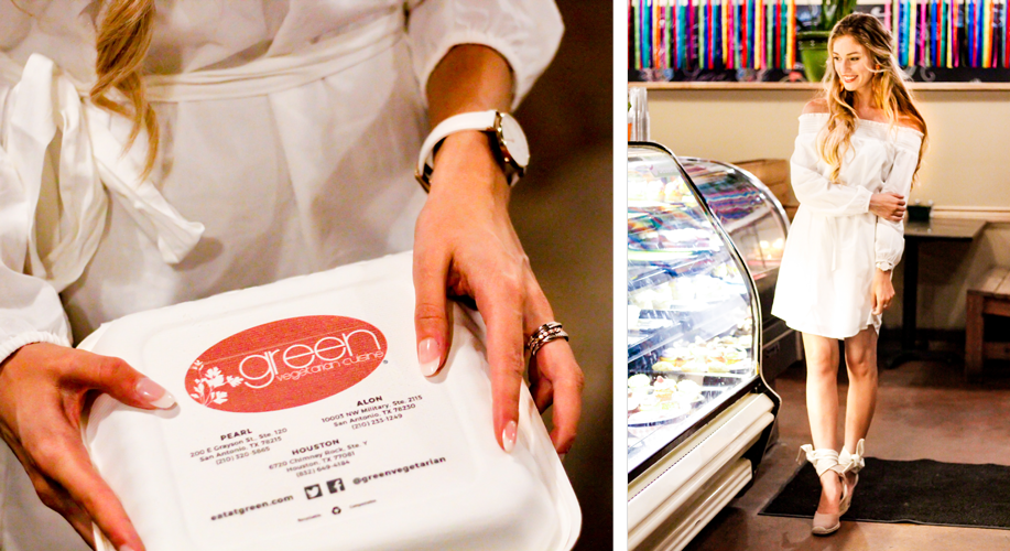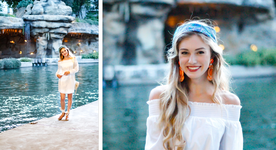 My final look was a classic white off-the-shoulder dress that can easily transition from day to night if you find yourself spending more time on the river than you expected. Which is exactly what happened when I wore this dress. I had meandered into the Pearl and found myself at Green Vegetarian Cuisine with my two best friends. If you are looking for a healthy and delicious spot in the area, this is the place. I had the Mediterranean Bowl and couldn’t get enough of their yummy humus and falafel patties. I felt perfectly in place inside the colorful restaurant with my floral scarf headband and orange Alejandra Aspillaga earrings.
